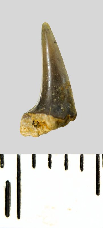 Зуб (фрагмент). Акула. Eostriatolamia subulata (Agassiz, 1843). Классификация: Хордовые Chordata, Позвоночные Vertebrata, Хрящевые рыбы Chondrichthyes, Пластиножаберные Elasmobranchii, Акулы Selachii, Ламнообразные Lamniformes, Песчаные акулы Odontaspididae