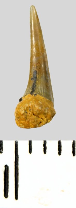 Зуб (фрагмент). Акула. Eostriatolamia subulata (Agassiz, 1843). Классификация: Хордовые Chordata, Позвоночные Vertebrata, Хрящевые рыбы Chondrichthyes, Пластиножаберные Elasmobranchii, Акулы Selachii, Ламнообразные Lamniformes, Песчаные акулы Odontaspididae