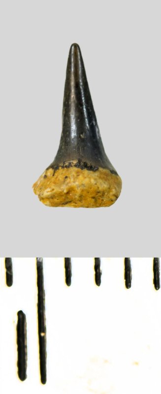 Зуб (фрагмент). Акула. Eostriatolamia subulata (Agassiz, 1843). Классификация: Хордовые Chordata, Позвоночные Vertebrata, Хрящевые рыбы Chondrichthyes, Пластиножаберные Elasmobranchii, Акулы Selachii, Ламнообразные Lamniformes, Песчаные акулы Odontaspididae
