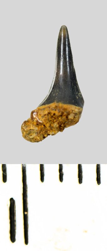 Зуб (фрагмент). Акула. Eostriatolamia subulata (Agassiz, 1843). Классификация: Хордовые Chordata, Позвоночные Vertebrata, Хрящевые рыбы Chondrichthyes, Пластиножаберные Elasmobranchii, Акулы Selachii, Ламнообразные Lamniformes, Песчаные акулы Odontaspididae