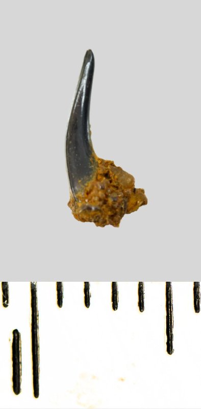 Коронка мелкого бокового зуба серого цвета, колюще-режущего типа, S-образно изогнутая, с гладким режущим краем. С лингвальной стороны у основания коронки на эмали имеется скульптура в виде слабой продольной струйчатости. Корень охристый, сохранился фрагментарно
