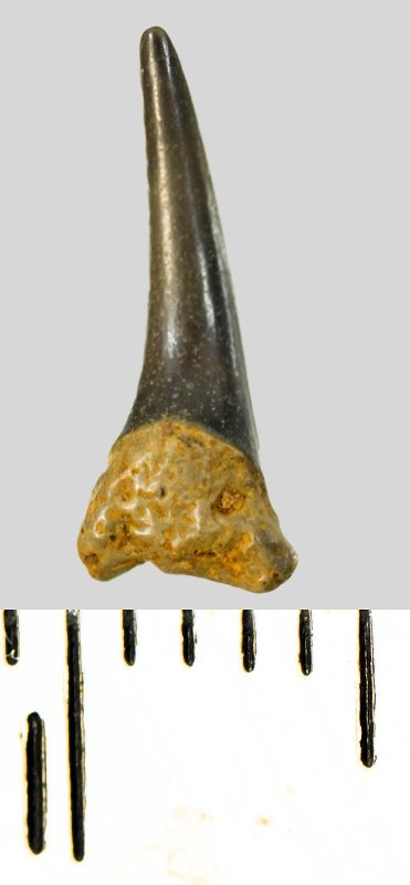 Зуб (фрагмент). Акула. Eostriatolamia subulata (Agassiz, 1843). Классификация: Хордовые Chordata, Позвоночные Vertebrata, Хрящевые рыбы Chondrichthyes, Пластиножаберные Elasmobranchii, Акулы Selachii, Ламнообразные Lamniformes, Песчаные акулы Odontaspididae