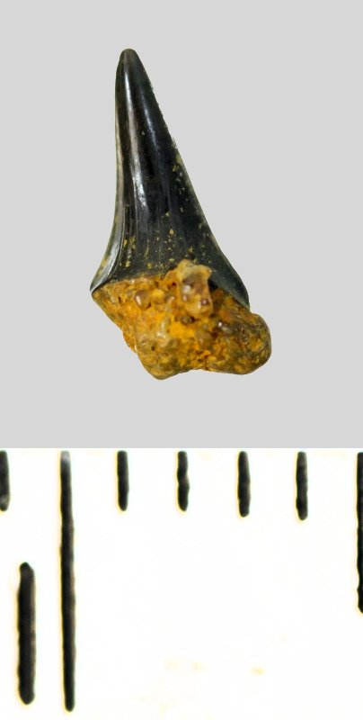 Зуб (фрагмент). Акула. Eostriatolamia subulata (Agassiz, 1843). Классификация: Хордовые Chordata, Позвоночные Vertebrata, Хрящевые рыбы Chondrichthyes, Пластиножаберные Elasmobranchii, Акулы Selachii, Ламнообразные Lamniformes, Песчаные акулы Odontaspididae