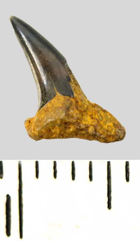 Зуб (фрагмент). Акула. Eostriatolamia subulata (Agassiz, 1843). Классификация: Хордовые Chordata, Позвоночные Vertebrata, Хрящевые рыбы Chondrichthyes, Пластиножаберные Elasmobranchii, Акулы Selachii, Ламнообразные Lamniformes, Песчаные акулы Odontaspididae
