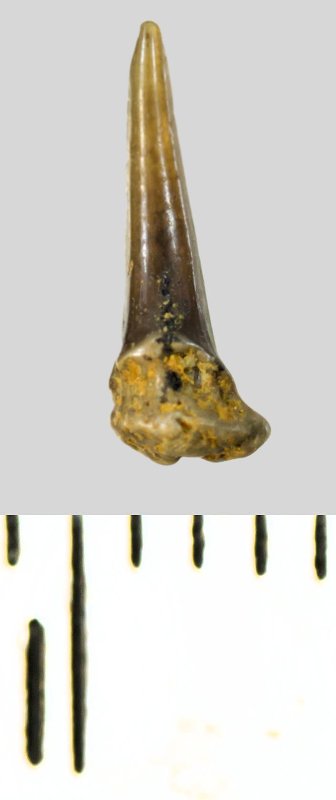 Коронка мелкого бокового зуба серого цвета, колюще-режущего типа, S-образно изогнутая, с гладким режущим краем. С лингвальной стороны у основания коронки на эмали имеется скульптура в виде слабой продольной струйчатости. Корень охристый, сохранился фрагментарно