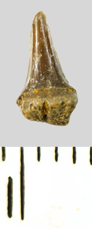 Коронка мелкого бокового зуба серого цвета, колюще-режущего типа, S-образно изогнутая, с гладким режущим краем. С лингвальной стороны у основания коронки на эмали имеется скульптура в виде слабой продольной струйчатости. Корень охристый, сохранился фрагментарно