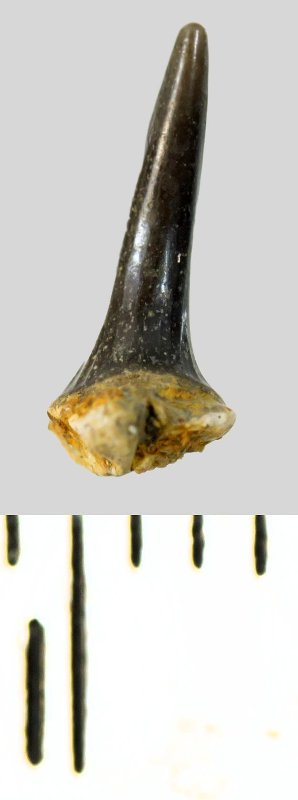 Зуб (фрагмент). Акула. Eostriatolamia subulata (Agassiz, 1843). Классификация: Хордовые Chordata, Позвоночные Vertebrata, Хрящевые рыбы Chondrichthyes, Пластиножаберные Elasmobranchii, Акулы Selachii, Ламнообразные Lamniformes, Песчаные акулы Odontaspididae