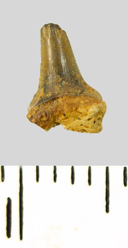 Зуб (фрагмент). Акула. Eostriatolamia subulata (Agassiz, 1843). Классификация: Хордовые Chordata, Позвоночные Vertebrata, Хрящевые рыбы Chondrichthyes, Пластиножаберные Elasmobranchii, Акулы Selachii, Ламнообразные Lamniformes, Песчаные акулы Odontaspididae