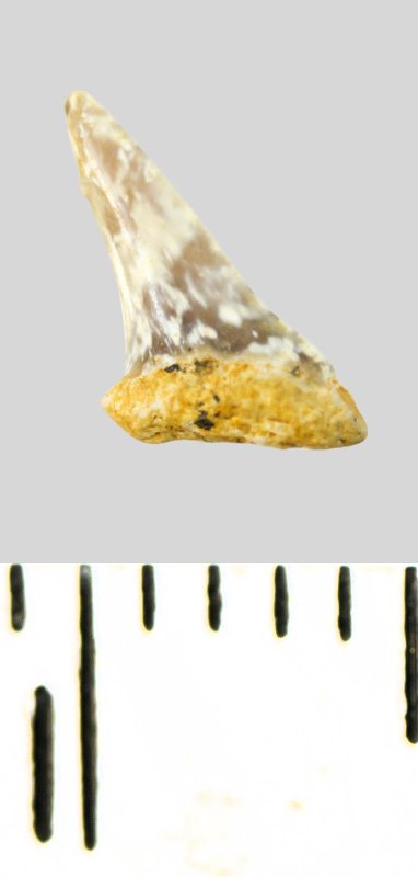 Зуб (фрагмент). Акула. Eostriatolamia subulata (Agassiz, 1843). Классификация: Хордовые Chordata, Позвоночные Vertebrata, Хрящевые рыбы Chondrichthyes, Пластиножаберные Elasmobranchii, Акулы Selachii, Ламнообразные Lamniformes, Песчаные акулы Odontaspididae