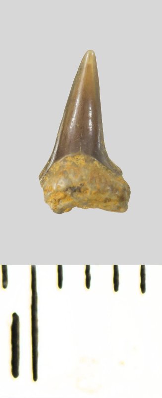 Зуб (фрагмент). Акула. Eostriatolamia subulata (Agassiz, 1843). Классификация: Хордовые Chordata, Позвоночные Vertebrata, Хрящевые рыбы Chondrichthyes, Пластиножаберные Elasmobranchii, Акулы Selachii, Ламнообразные Lamniformes, Песчаные акулы Odontaspididae