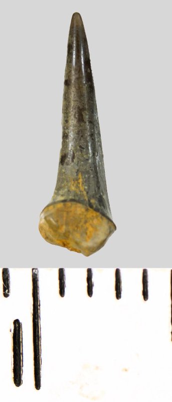 Коронка мелкого бокового зуба серого цвета, колюще-режущего типа, S-образно изогнутая, с гладким режущим краем. С лингвальной стороны у основания коронки на эмали имеется скульптура в виде слабой продольной струйчатости. Корень охристый, сохранился фрагментарно