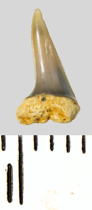 Зуб (фрагмент). Акула. Eostriatolamia subulata (Agassiz, 1843). Классификация: Хордовые Chordata, Позвоночные Vertebrata, Хрящевые рыбы Chondrichthyes, Пластиножаберные Elasmobranchii, Акулы Selachii, Ламнообразные Lamniformes, Песчаные акулы Odontaspididae