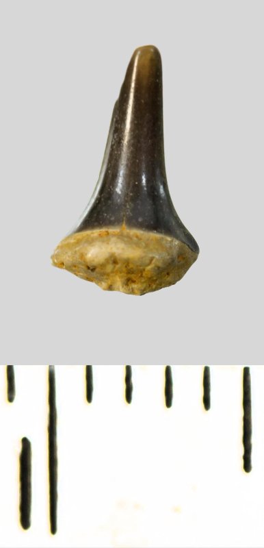 Зуб (фрагмент). Акула. Eostriatolamia subulata (Agassiz, 1843). Классификация: Хордовые Chordata, Позвоночные Vertebrata, Хрящевые рыбы Chondrichthyes, Пластиножаберные Elasmobranchii, Акулы Selachii, Ламнообразные Lamniformes, Песчаные акулы Odontaspididae