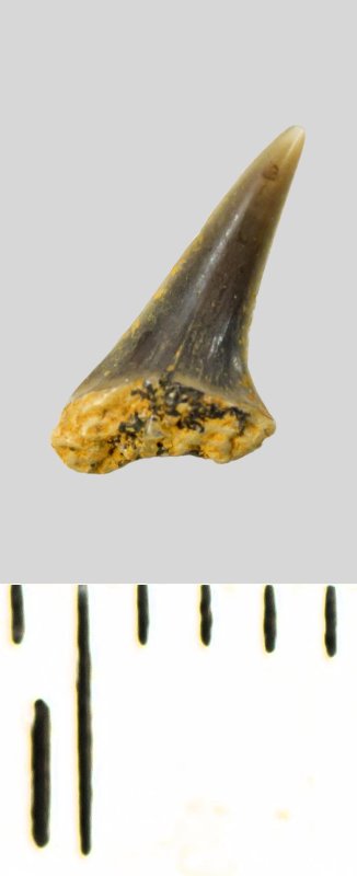 Зуб (фрагмент). Акула. Eostriatolamia subulata (Agassiz, 1843). Классификация: Хордовые Chordata, Позвоночные Vertebrata, Хрящевые рыбы Chondrichthyes, Пластиножаберные Elasmobranchii, Акулы Selachii, Ламнообразные Lamniformes, Песчаные акулы Odontaspididae