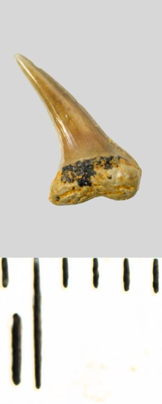 Зуб (фрагмент). Акула. Eostriatolamia subulata (Agassiz, 1843). Классификация: Хордовые Chordata, Позвоночные Vertebrata, Хрящевые рыбы Chondrichthyes, Пластиножаберные Elasmobranchii, Акулы Selachii, Ламнообразные Lamniformes, Песчаные акулы Odontaspididae