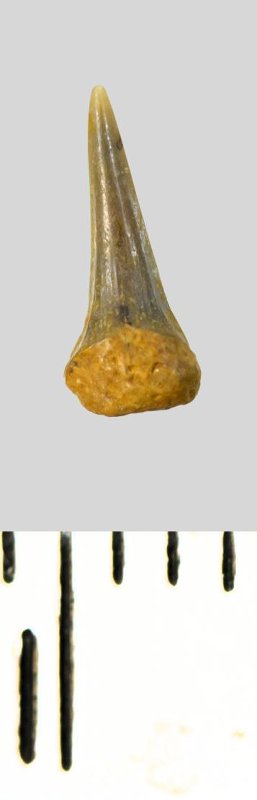 Зуб (фрагмент). Акула. Eostriatolamia subulata (Agassiz, 1843). Классификация: Хордовые Chordata, Позвоночные Vertebrata, Хрящевые рыбы Chondrichthyes, Пластиножаберные Elasmobranchii, Акулы Selachii, Ламнообразные Lamniformes, Песчаные акулы Odontaspididae