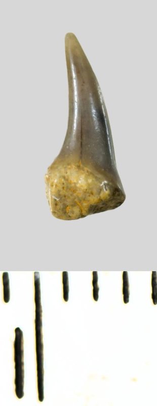 Коронка мелкого бокового зуба серого цвета, колюще-режущего типа, S-образно изогнутая, с гладким режущим краем. С лингвальной стороны у основания коронки на эмали имеется скульптура в виде слабой продольной струйчатости. Корень охристый, сохранился фрагментарно
