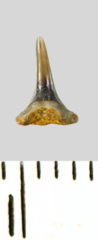 Зуб (фрагмент). Акула. Eostriatolamia subulata (Agassiz, 1843). Классификация: Хордовые Chordata, Позвоночные Vertebrata, Хрящевые рыбы Chondrichthyes, Пластиножаберные Elasmobranchii, Акулы Selachii, Ламнообразные Lamniformes, Песчаные акулы Odontaspididae