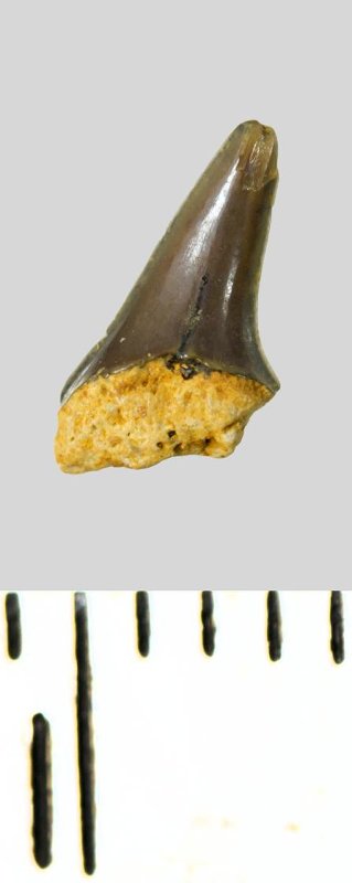 Зуб (фрагмент). Акула. Eostriatolamia subulata (Agassiz, 1843). Классификация: Хордовые Chordata, Позвоночные Vertebrata, Хрящевые рыбы Chondrichthyes, Пластиножаберные Elasmobranchii, Акулы Selachii, Ламнообразные Lamniformes, Песчаные акулы Odontaspididae