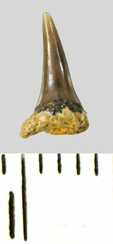 Зуб (фрагмент). Акула. Eostriatolamia subulata (Agassiz, 1843). Классификация: Хордовые Chordata, Позвоночные Vertebrata, Хрящевые рыбы Chondrichthyes, Пластиножаберные Elasmobranchii, Акулы Selachii, Ламнообразные Lamniformes, Песчаные акулы Odontaspididae