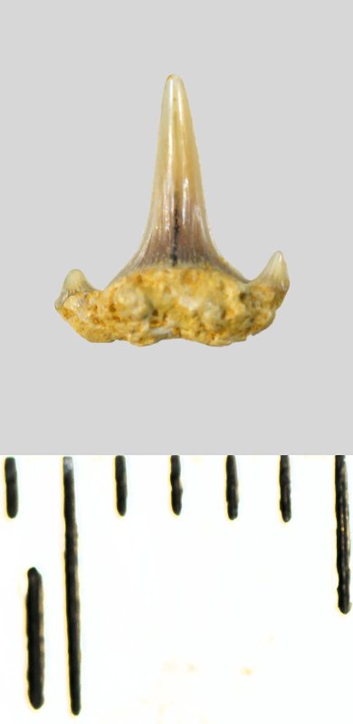 Зуб (фрагмент). Акула. Eostriatolamia subulata (Agassiz, 1843). Классификация: Хордовые Chordata, Позвоночные Vertebrata, Хрящевые рыбы Chondrichthyes, Пластиножаберные Elasmobranchii, Акулы Selachii, Ламнообразные Lamniformes, Песчаные акулы Odontaspididae