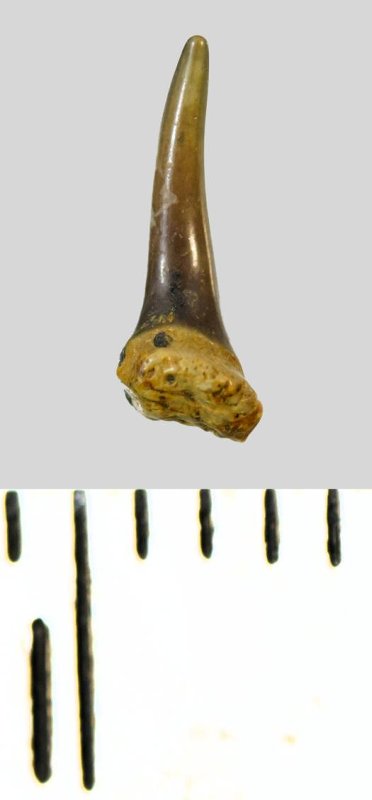 Коронка мелкого бокового зуба серого цвета, колюще-режущего типа, S-образно изогнутая, с гладким режущим краем. С лингвальной стороны у основания коронки на эмали имеется скульптура в виде слабой продольной струйчатости. Корень охристый, сохранился фрагментарно