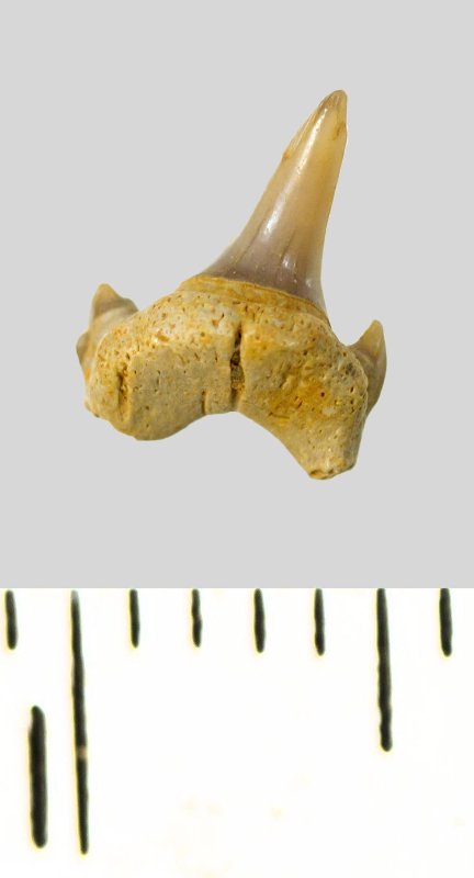 Мелкий боковой зуб с коронкой серого цвета, колюще-режущего типа, S-образно изогнутой, с гладким режущим краем. С лингвальной стороны у основания коронки на эмали имеется скульптура в виде слабой продольной струйчатости. Корень охристый, арочный, умеренно массивный, со следами окатанности. С лингвальной стороны корня одна питательная борозда. Имеется одна пара добавочных зубцов коронки.