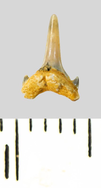 Мелкий боковой зуб с коронкой серого цвета, колюще-режущего типа, S-образно изогнутой, с гладким режущим краем. С лингвальной стороны у основания коронки на эмали имеется скульптура в виде слабой продольной струйчатости. Корень охристый, арочный, умеренно массивный, со следами окатанности. С лингвальной стороны корня одна питательная борозда. Имеется одна пара добавочных зубцов коронки.