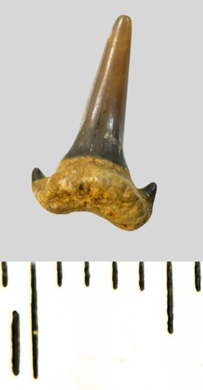 Мелкий боковой зуб с коронкой серого цвета, колюще-режущего типа, S-образно изогнутой, с гладким режущим краем. С лингвальной стороны у основания коронки на эмали имеется скульптура в виде слабой продольной струйчатости. Корень охристый, арочный, умеренно массивный, со следами окатанности. С лингвальной стороны корня одна питательная борозда. Имеется одна пара добавочных зубцов коронки.