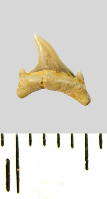 Мелкий боковой зуб с коронкой серого цвета, колюще-режущего типа, S-образно изогнутой, с гладким режущим краем. С лингвальной стороны у основания коронки на эмали имеется скульптура в виде слабой продольной струйчатости. Корень охристый, арочный, умеренно массивный, со следами окатанности. С лингвальной стороны корня одна питательная борозда. Имеется одна пара добавочных зубцов коронки.