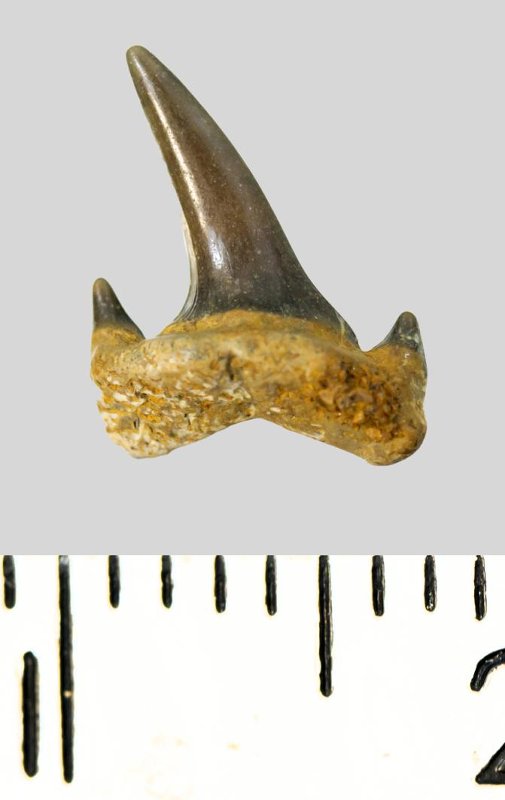 Мелкий боковой зуб с коронкой серого цвета, колюще-режущего типа, S-образно изогнутой, с гладким режущим краем. С лингвальной стороны у основания коронки на эмали имеется скульптура в виде слабой продольной струйчатости. Корень охристый, арочный, умеренно массивный, со следами окатанности. С лингвальной стороны корня одна питательная борозда. Имеется одна пара добавочных зубцов коронки.
