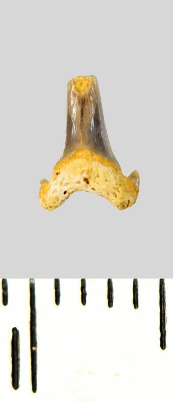 Мелкий боковой зуб с коронкой серого цвета, колюще-режущего типа, S-образно изогнутой, с гладким режущим краем. С лингвальной стороны у основания коронки на эмали имеется скульптура в виде слабой продольной струйчатости. Корень охристый, арочный, умеренно массивный, со следами окатанности. С лингвальной стороны корня одна питательная борозда. Имеется одна пара добавочных зубцов коронки.
