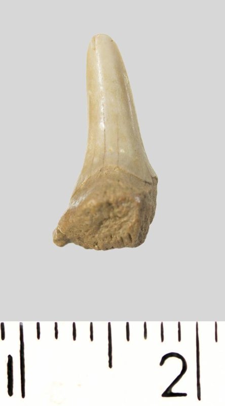 Зуб (фрагмент). Акула. Archaeolamna cf. kopingensis (Davis, 1890). Классификация: Хордовые Chordata, Позвоночные Vertebrata, Хрящевые рыбы Chondrichthyes, Пластиножаберные Elasmobranchii, Акулы Selachii, Ламнообразные Lamniformes, Cretoxyrhinidae