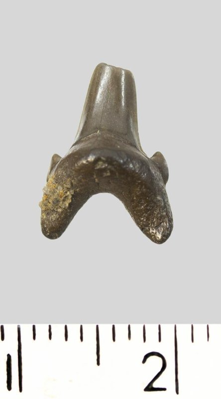 Зуб. Акула. Archaeolamna cf. kopingensis (Davis, 1890). Классификация: Хордовые Chordata, Позвоночные Vertebrata, Хрящевые рыбы Chondrichthyes, Пластиножаберные Elasmobranchii, Акулы Selachii, Ламнообразные Lamniformes, Cretoxyrhinidae