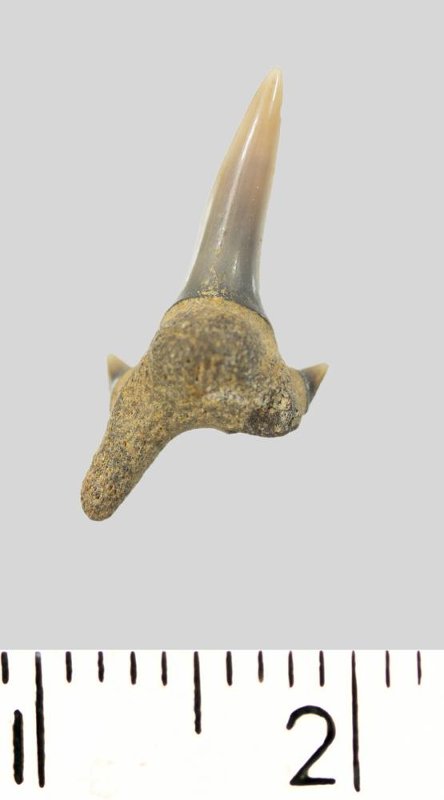 Зуб. Акула. Protolamna cf. sokolovi Cappetta, 1980. Классификация: Хордовые Chordata, Позвоночные Vertebrata, Хрящевые рыбы Chondrichthyes, Пластиножаберные Elasmobranchii, Акулы Selachii, Ламнообразные Lamniformes, Pseudoscapanorhynchidae
