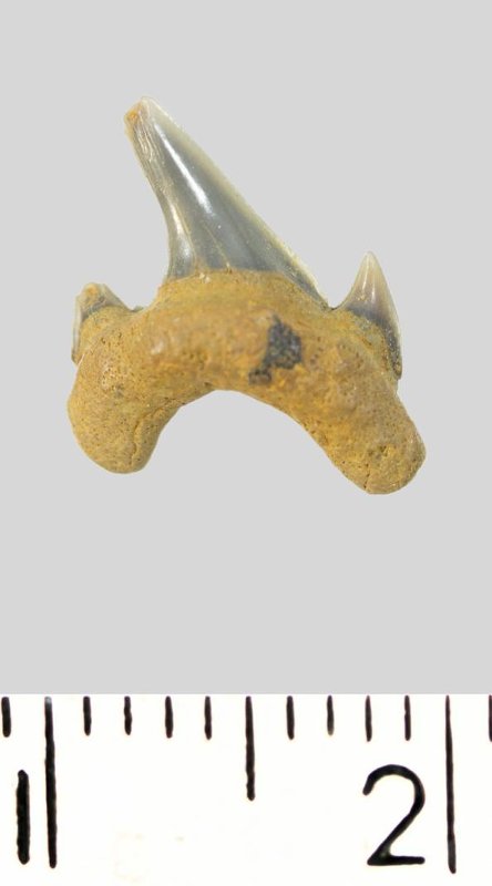 Зуб. Акула. Protolamna cf. sokolovi Cappetta, 1980. Классификация: Хордовые Chordata, Позвоночные Vertebrata, Хрящевые рыбы Chondrichthyes, Пластиножаберные Elasmobranchii, Акулы Selachii, Ламнообразные Lamniformes, Pseudoscapanorhynchidae