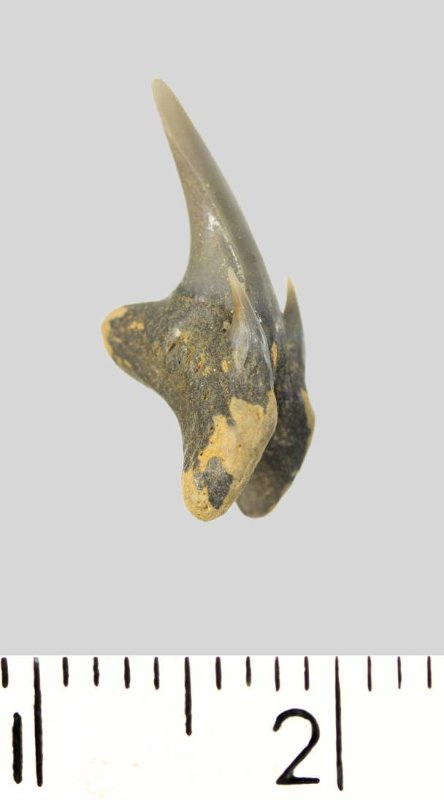 Зуб. Акула. Pseudoscapanorhynchus compressidens Herman, 1977. Классификация: Хордовые Chordata, Позвоночные Vertebrata, Хрящевые рыбы Chondrichthyes, Пластиножаберные Elasmobranchii, Акулы Selachii, Ламнообразные Lamniformes, Pseudoscapanorhynchidae