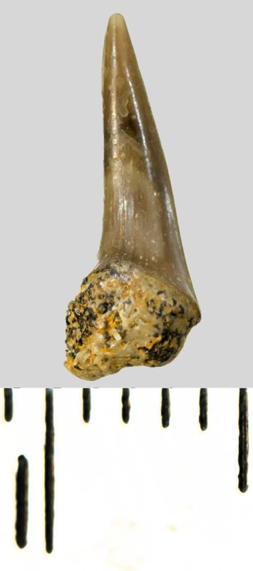 Зуб (фрагмент). Акула. Eostriatolamia subulata (Agassiz, 1843). Классификация: Хордовые Chordata, Позвоночные Vertebrata, Хрящевые рыбы Chondrichthyes, Пластиножаберные Elasmobranchii, Акулы Selachii, Ламнообразные Lamniformes, Песчаные акулы Odontaspididae