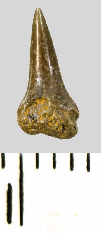 Зуб (фрагмент). Акула. Eostriatolamia subulata (Agassiz, 1843). Классификация: Хордовые Chordata, Позвоночные Vertebrata, Хрящевые рыбы Chondrichthyes, Пластиножаберные Elasmobranchii, Акулы Selachii, Ламнообразные Lamniformes, Песчаные акулы Odontaspididae