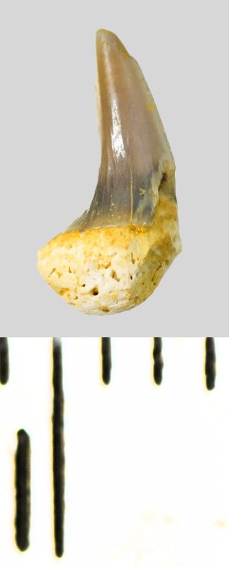 Зуб (фрагмент). Акула. Eostriatolamia subulata (Agassiz, 1843). Классификация: Хордовые Chordata, Позвоночные Vertebrata, Хрящевые рыбы Chondrichthyes, Пластиножаберные Elasmobranchii, Акулы Selachii, Ламнообразные Lamniformes, Песчаные акулы Odontaspididae