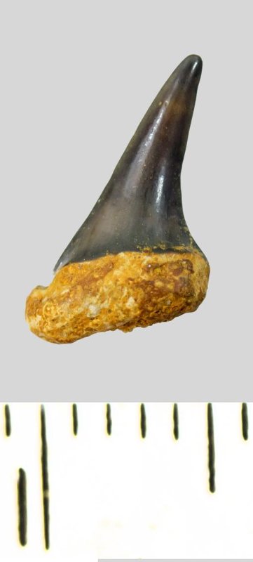Зуб (фрагмент). Акула. Eostriatolamia subulata (Agassiz, 1843). Классификация: Хордовые Chordata, Позвоночные Vertebrata, Хрящевые рыбы Chondrichthyes, Пластиножаберные Elasmobranchii, Акулы Selachii, Ламнообразные Lamniformes, Песчаные акулы Odontaspididae