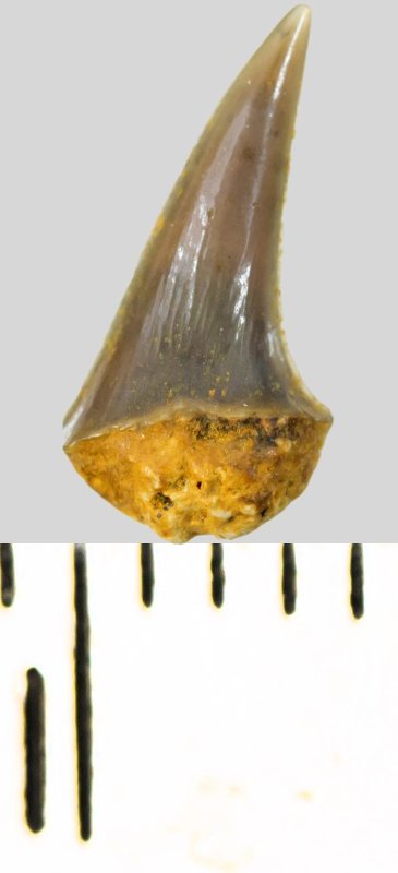Зуб (фрагмент). Акула. Eostriatolamia subulata (Agassiz, 1843). Классификация: Хордовые Chordata, Позвоночные Vertebrata, Хрящевые рыбы Chondrichthyes, Пластиножаберные Elasmobranchii, Акулы Selachii, Ламнообразные Lamniformes, Песчаные акулы Odontaspididae