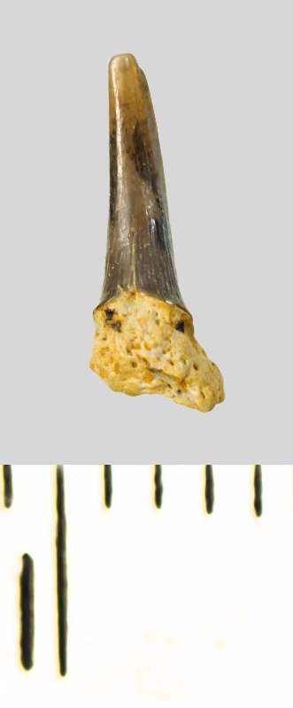 Коронка мелкого бокового зуба серого цвета, колюще-режущего типа, S-образно изогнутая, с гладким режущим краем. С лингвальной стороны у основания коронки на эмали имеется скульптура в виде слабой продольной струйчатости. Корень охристый, сохранился фрагментарно