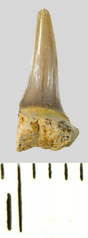 Зуб (фрагмент). Акула. Eostriatolamia subulata (Agassiz, 1843). Классификация: Хордовые Chordata, Позвоночные Vertebrata, Хрящевые рыбы Chondrichthyes, Пластиножаберные Elasmobranchii, Акулы Selachii, Ламнообразные Lamniformes, Песчаные акулы Odontaspididae