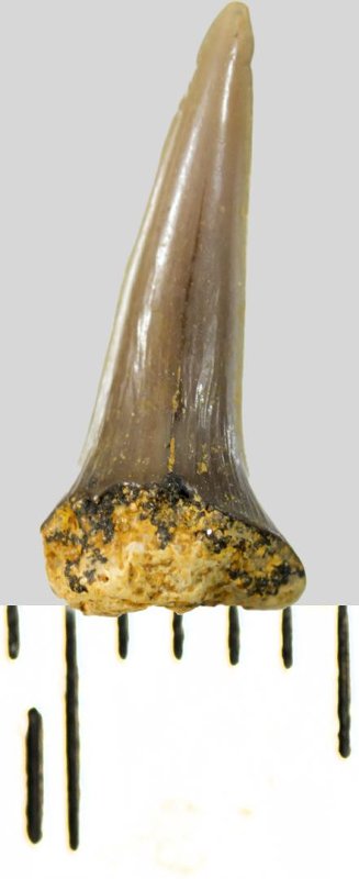 Зуб (фрагмент). Акула. Eostriatolamia subulata (Agassiz, 1843). Классификация: Хордовые Chordata, Позвоночные Vertebrata, Хрящевые рыбы Chondrichthyes, Пластиножаберные Elasmobranchii, Акулы Selachii, Ламнообразные Lamniformes, Песчаные акулы Odontaspididae
