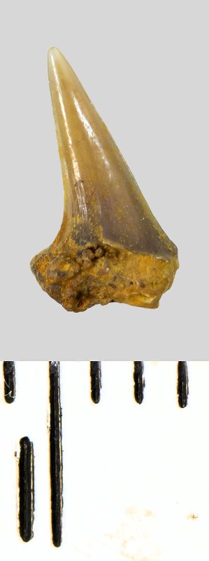 Зуб (фрагмент). Акула. Eostriatolamia subulata (Agassiz, 1843). Классификация: Хордовые Chordata, Позвоночные Vertebrata, Хрящевые рыбы Chondrichthyes, Пластиножаберные Elasmobranchii, Акулы Selachii, Ламнообразные Lamniformes, Песчаные акулы Odontaspididae