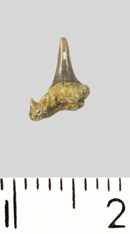Зуб. Акула. Synechodus dubrisiensis (Mackie, 1863). Классификация: Хордовые Chordata, Позвоночные Vertebrata, Хрящевые рыбы Chondrichthyes, Пластиножаберные Elasmobranchii, Акулы Selachii, Синеходонтообразные Synechodontiformes, Palaeospinacidae
