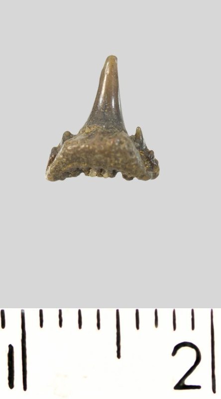 Зуб. Акула. Synechodus dubrisiensis (Mackie, 1863). Классификация: Хордовые Chordata, Позвоночные Vertebrata, Хрящевые рыбы Chondrichthyes, Пластиножаберные Elasmobranchii, Акулы Selachii, Синеходонтообразные Synechodontiformes, Palaeospinacidae