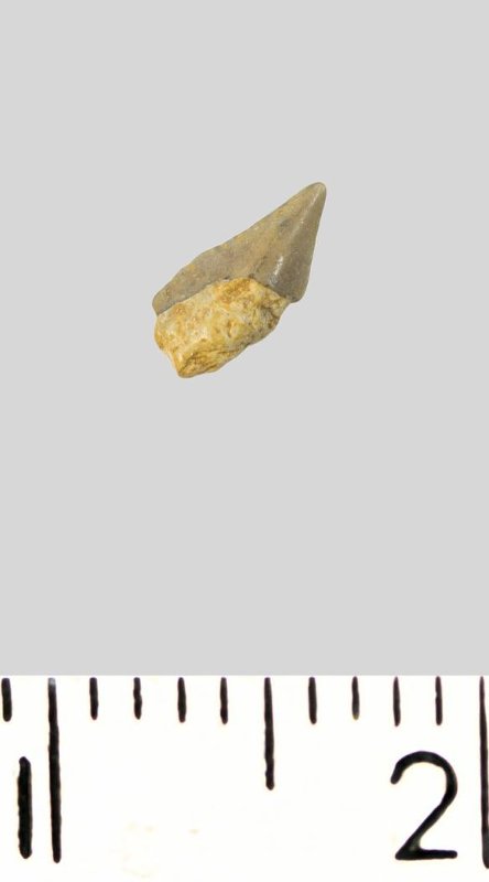 Зуб (фрагмент). Акула. Palaeoanacorax volgensis Glickman, 1971. Классификация: Хордовые Chordata, Позвоночные Vertebrata, Хрящевые рыбы Chondrichthyes, Пластиножаберные Elasmobranchii, Акулы Selachii, Ламнообразные Lamniformes, Anacoracidae