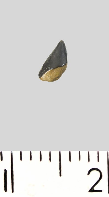 Зуб (фрагмент). Акула. Palaeoanacorax volgensis Glickman, 1971. Классификация: Хордовые Chordata, Позвоночные Vertebrata, Хрящевые рыбы Chondrichthyes, Пластиножаберные Elasmobranchii, Акулы Selachii, Ламнообразные Lamniformes, Anacoracidae